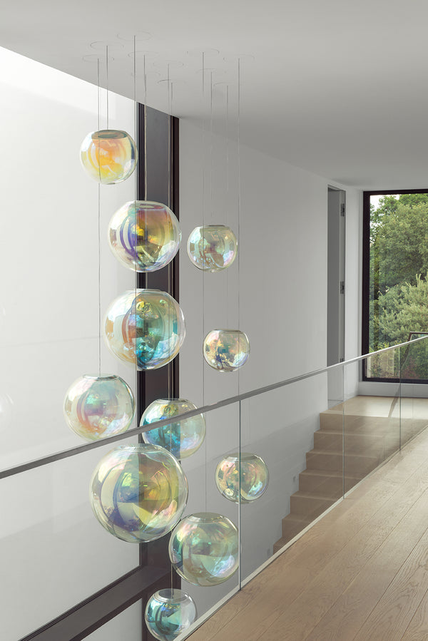 Die neue Iris Globe Serie präsentiert eine Reihe technischer Innovationen, die sowohl Qualität als auch Design auf ein neues Niveau heben. Alle sichtbaren Metallelemente werden nun aus Edelstahl statt Aluminium gefertigt, was die Materialqualität und Langlebigkeit verbessert. Die Deckenhalterung und die Mönchskappe wurden deutlich verkleinert und sorgen so für ein schlankeres und eleganteres Erscheinungsbild. Die neu gestaltete Mönchskappe verfügt jetzt über ein austauschbares OLED-Panel und eine staubdichte Verbindung zur Glaskugel, was eine lange Lebensdauer und einfache Wartung gewährleistet. Die Installation wird durch ein einzigartiges, ultradünnes 2 mm Metallgeflechtkabel, das in Stahl oder Messing erhältlich ist, noch einfacher. Mit der Einführung einer neuen Größe von 25 cm bietet die Iris Globe Serie noch mehr Flexibilität, um Ihre Beleuchtungsanforderungen zu erfüllen.