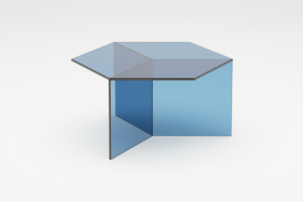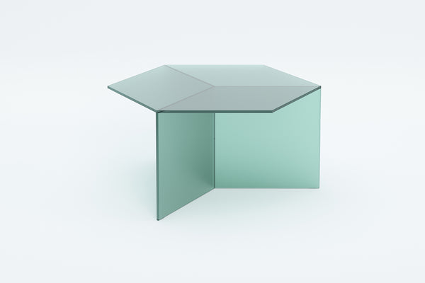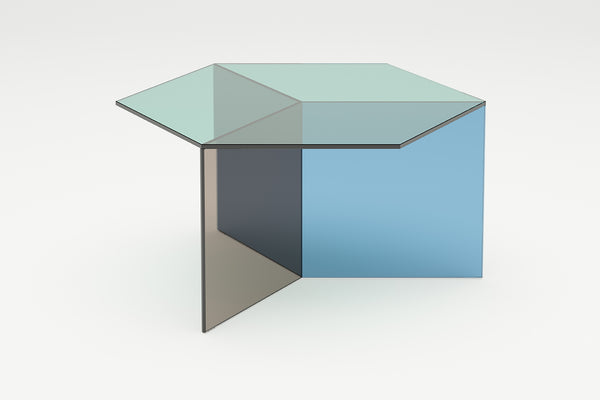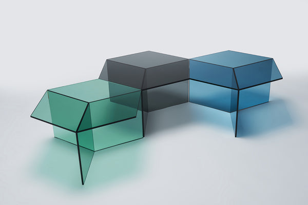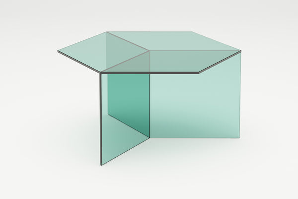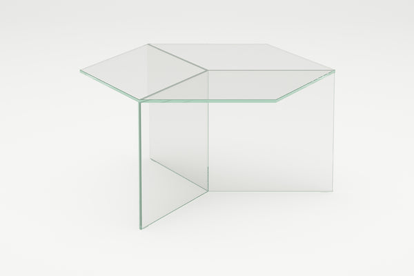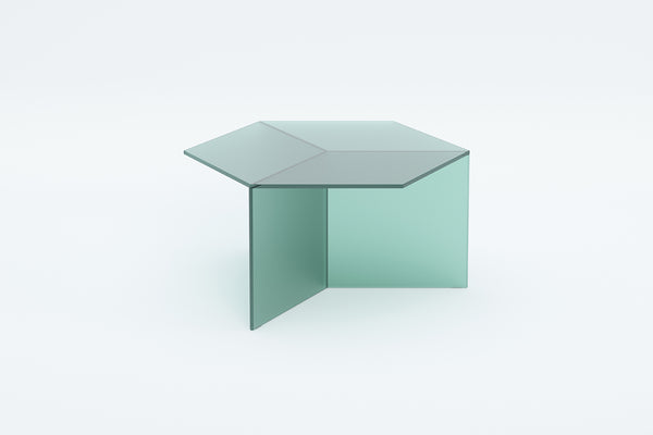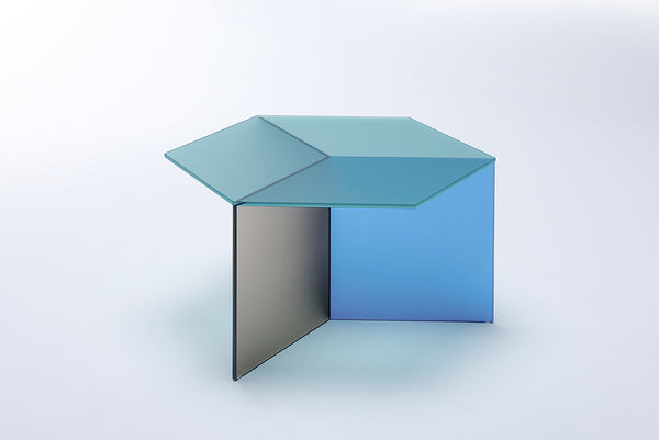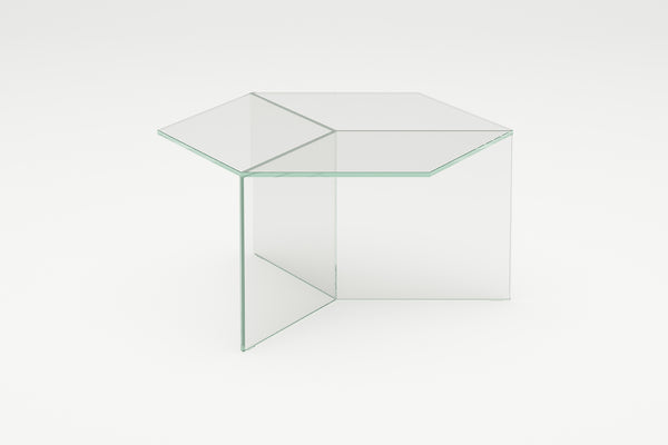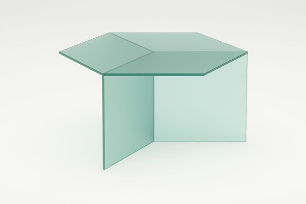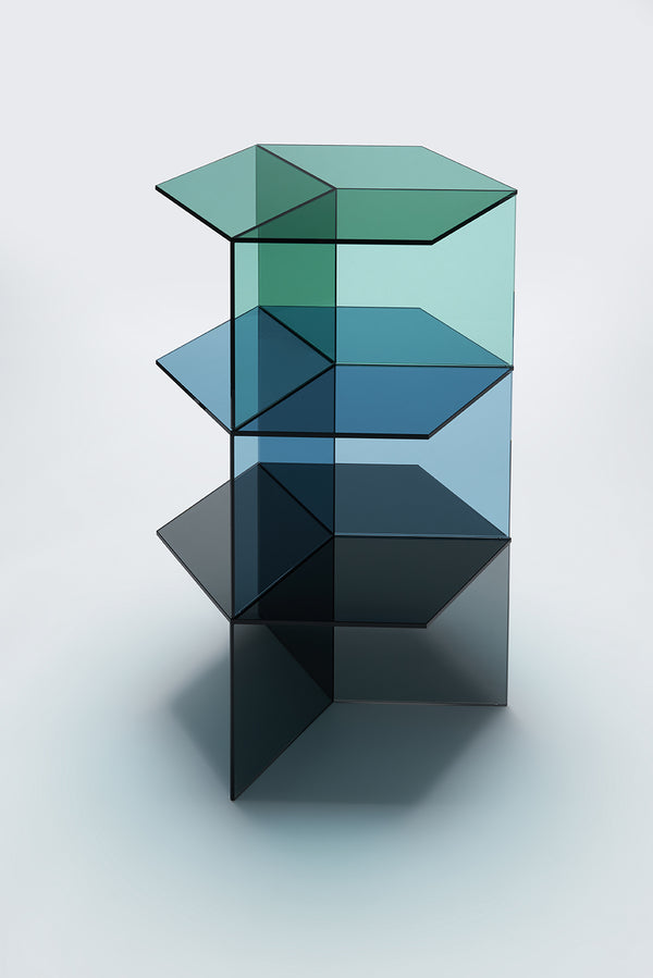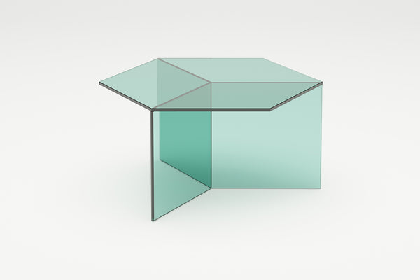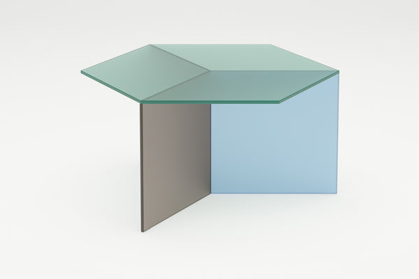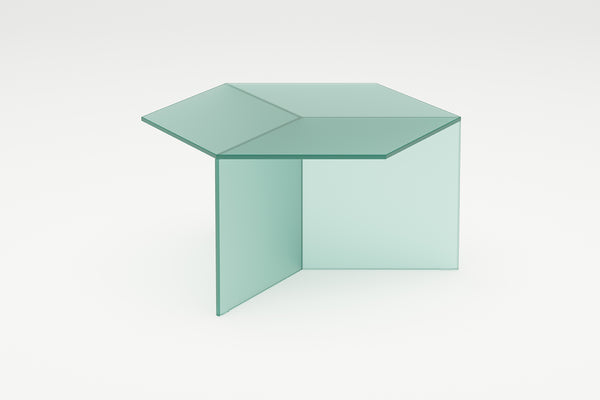 Die Isom Tische spielen mit einer faszinierenden optischen Täuschung. Die sechseckige Glasplatte ist mit drei senkrechten Fußelementen UV-verklebt deren Kanten aus einem bestimmten Blickwinkel betrachtet die perfekte isometrische Darstellung eines Würfels vermitteln. Ein besonderes Detail sind die CNC-geschliffenen doppelten Gehrungen und die fugenlose Verklebung der Fußelemente. Die unterschiedlichen Größen und Varianten lassen sich auf vielfältige Weise miteinander kombinieren. Die Glastische gibt es in fünf Farben, jeweils in Klarglas und Satinglas. Design: Sebastian Scherer