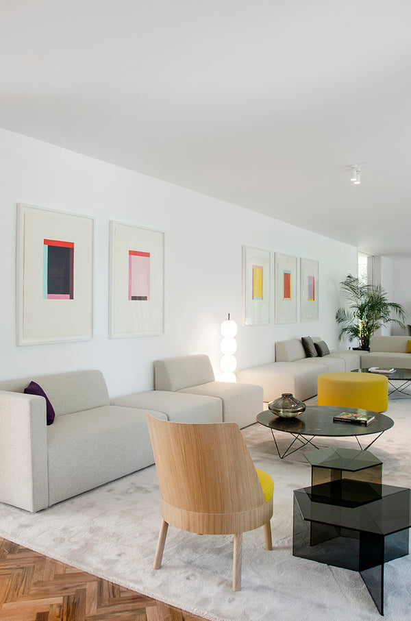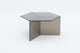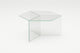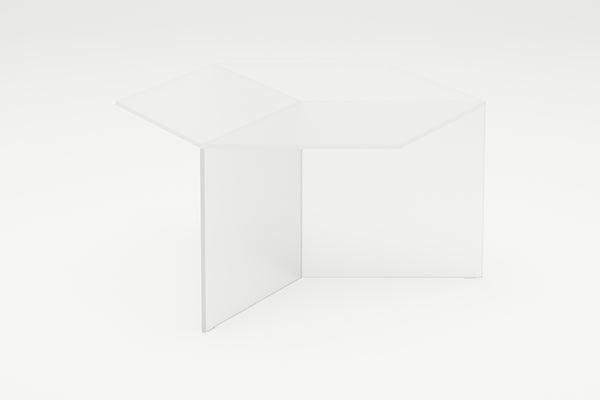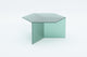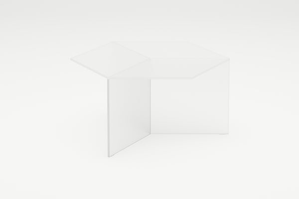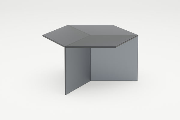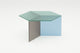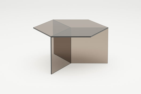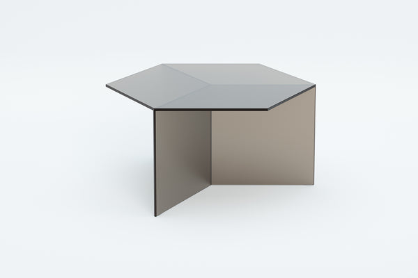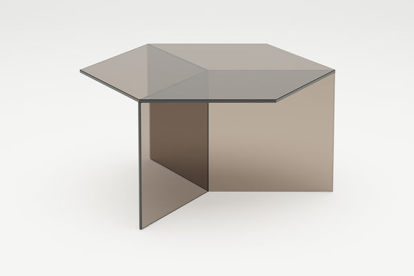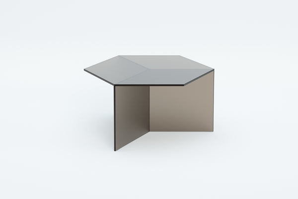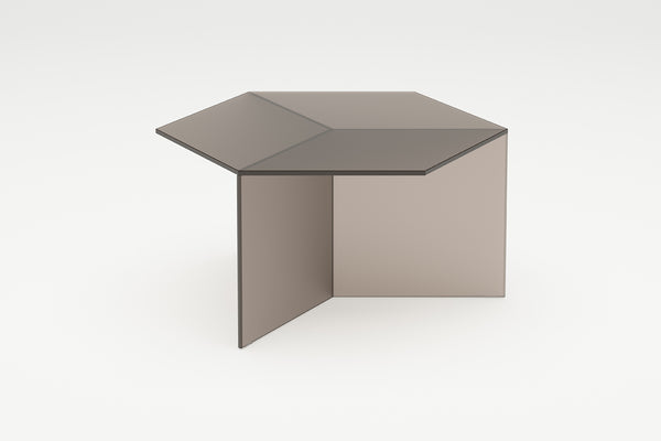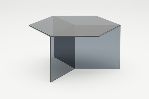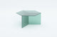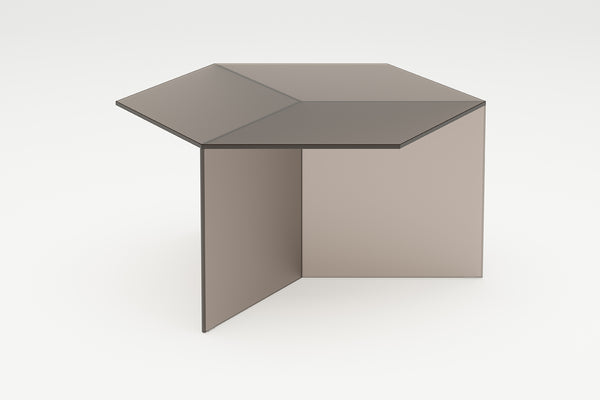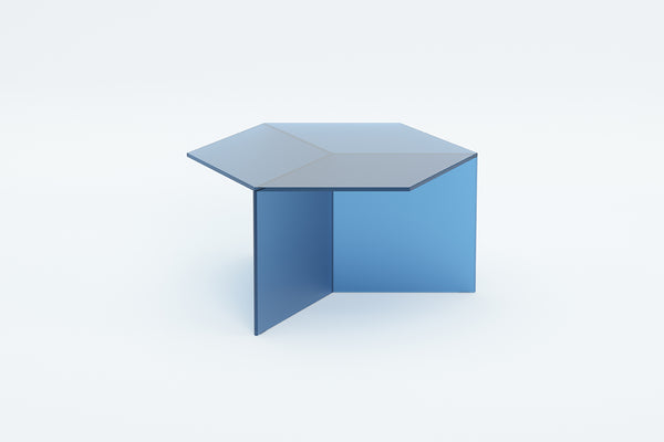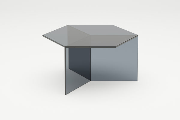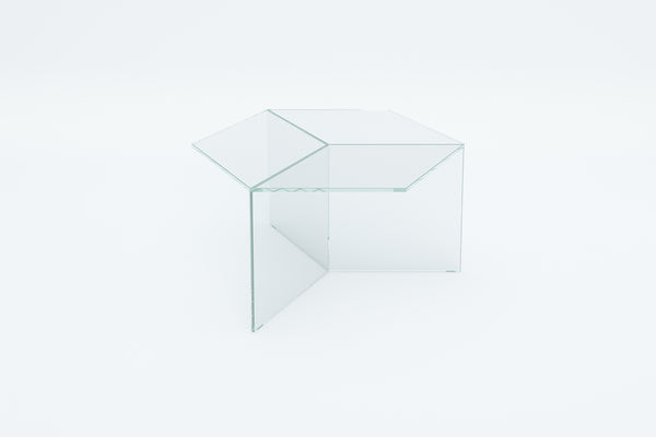 Die Isom Tische spielen mit einer faszinierenden optischen Täuschung. Die sechseckige Glasplatte ist mit drei senkrechten Fußelementen UV-verklebt deren Kanten aus einem bestimmten Blickwinkel betrachtet die perfekte isometrische Darstellung eines Würfels vermitteln. Ein besonderes Detail sind die CNC-geschliffenen doppelten Gehrungen und die fugenlose Verklebung der Fußelemente. Die unterschiedlichen Größen und Varianten lassen sich auf vielfältige Weise miteinander kombinieren. Die Glastische gibt es in fünf Farben, jeweils in Klarglas und Satinglas. Design: Sebastian Scherer