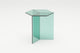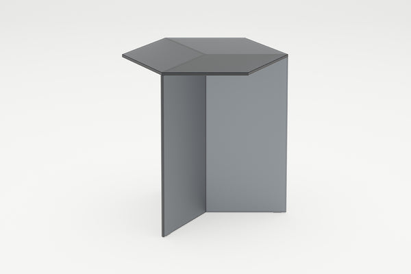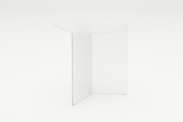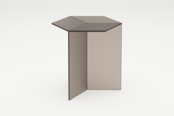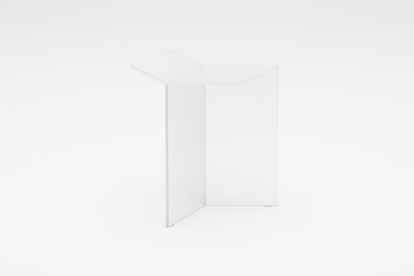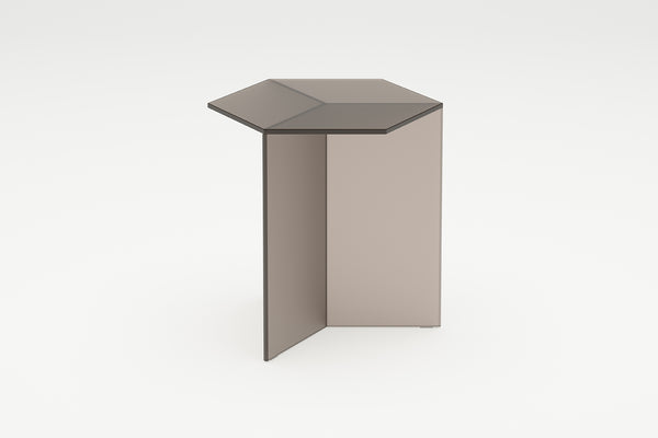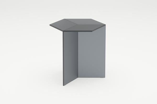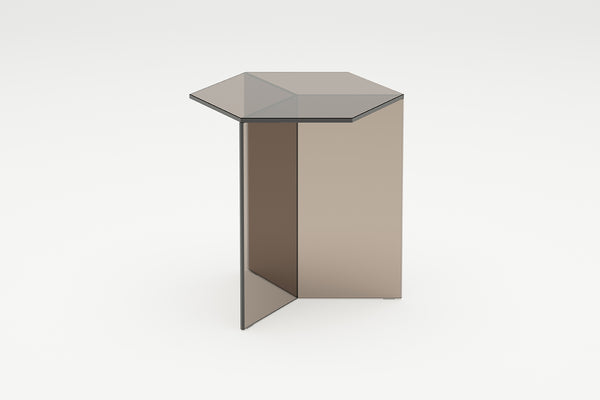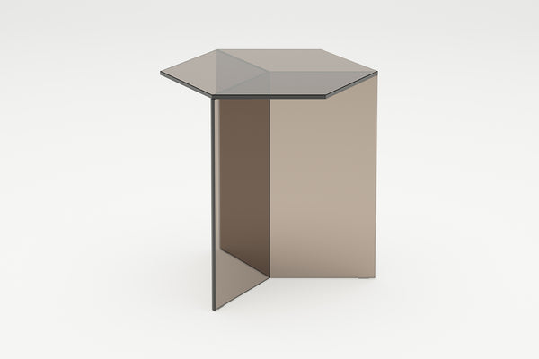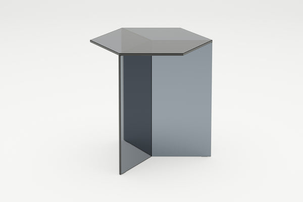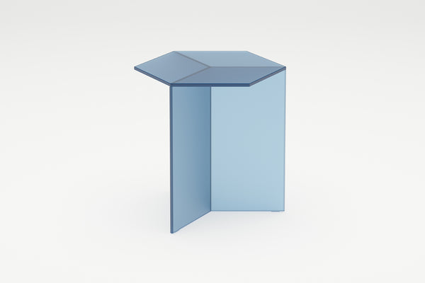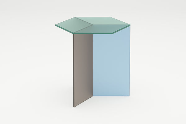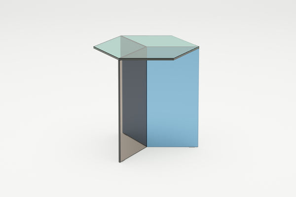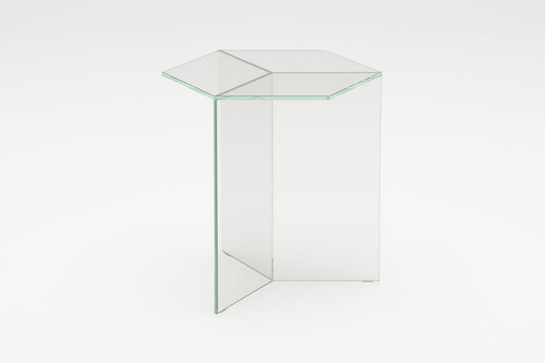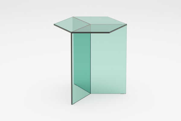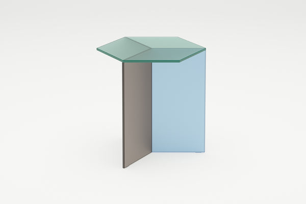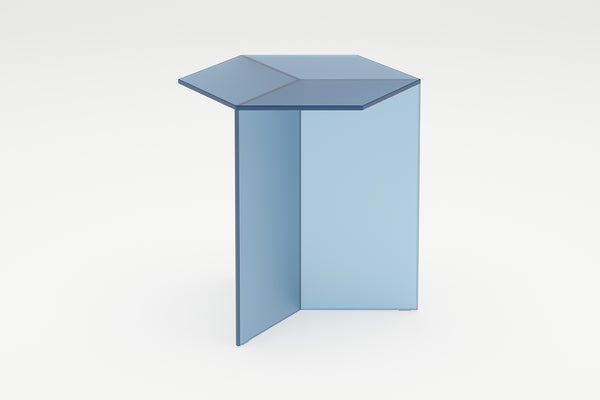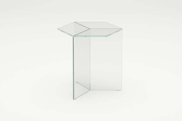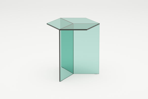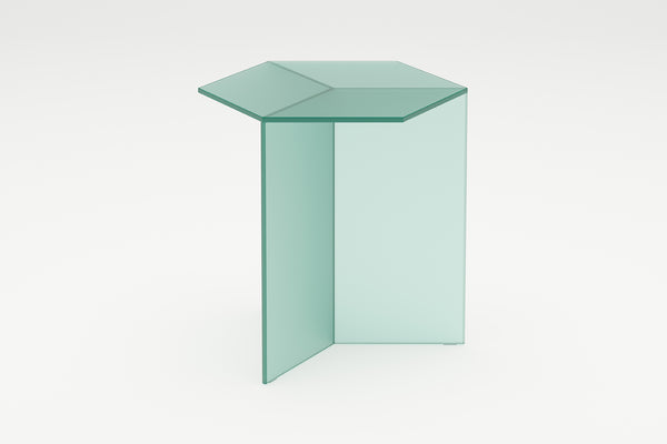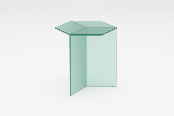 Die Isom Tische spielen mit einer faszinierenden optischen Täuschung. Die sechseckige Glasplatte ist mit drei senkrechten Fußelementen UV-verklebt deren Kanten aus einem bestimmten Blickwinkel betrachtet die perfekte isometrische Darstellung eines Würfels vermitteln. Ein besonderes Detail sind die CNC-geschliffenen doppelten Gehrungen und die fugenlose Verklebung der Fußelemente. Die unterschiedlichen Größen und Varianten lassen sich auf vielfältige Weise miteinander kombinieren. Die Glastische gibt es in fünf Farben, jeweils in Klarglas und Satinglas. Design: Sebastian Scherer