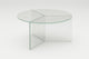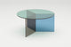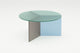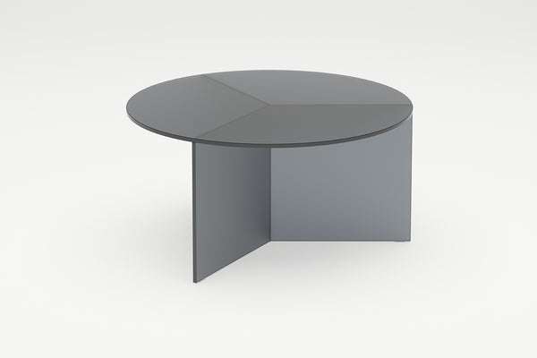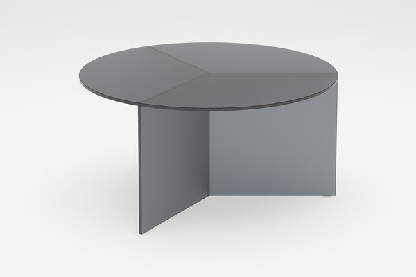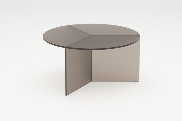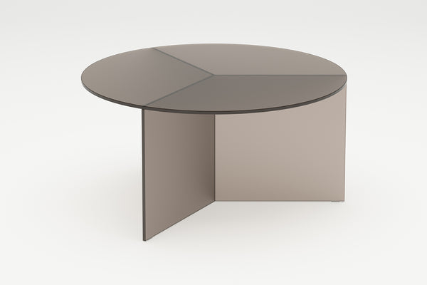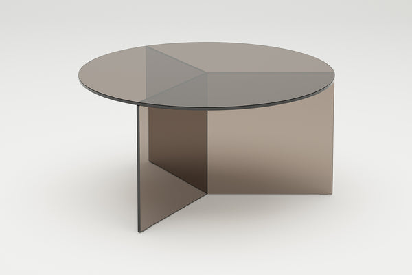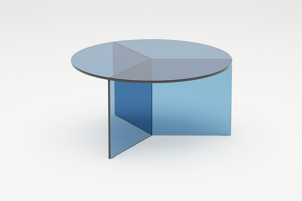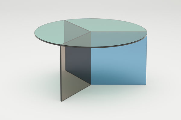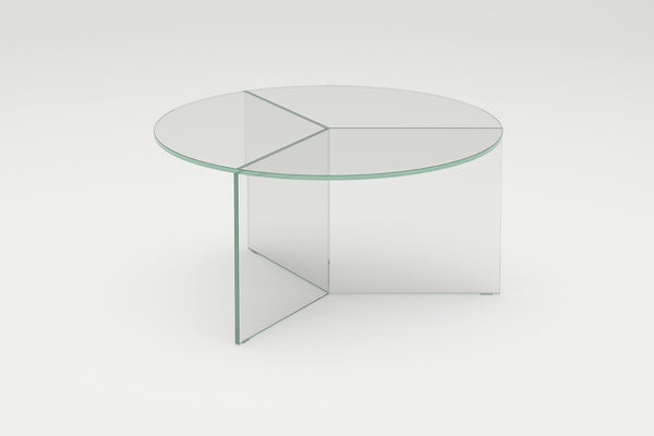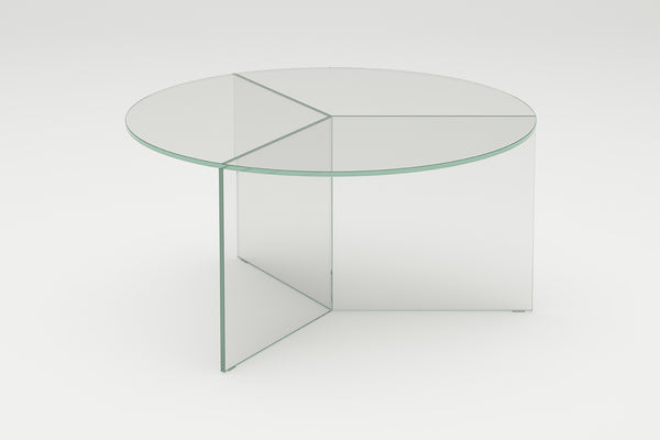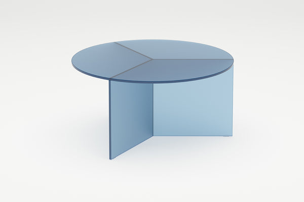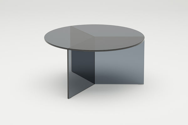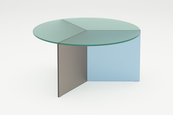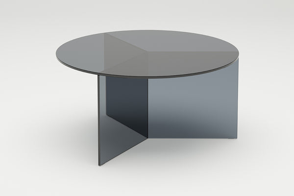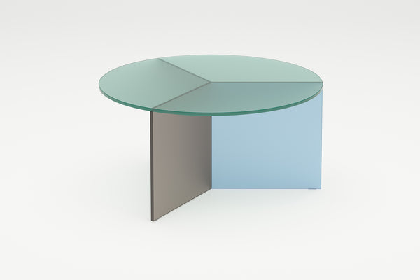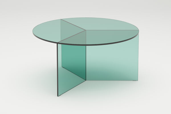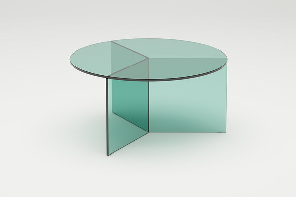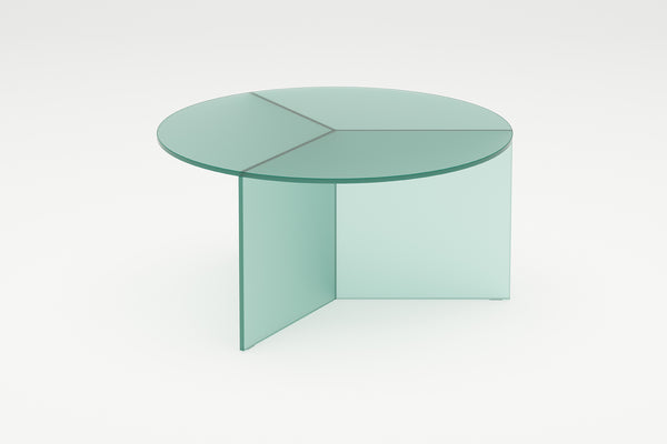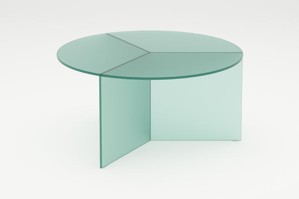 The Osom tables are the round version of the Isom tables and can be ideally combined with each other. As with the hexagonal Isom tables, the base consists of three foot elements arranged at equal angles, which give the table its sculptural appearance. This design idea from 2012 formed the beginning of the glass table series by Sebastian Scherer. A special detail are the CNC-ground double mitres in the middle and the jointless bonding of the foot elements. The glass tables are available in five colours, each in clear glass and satin glass. Design: Sebastian Scherer
